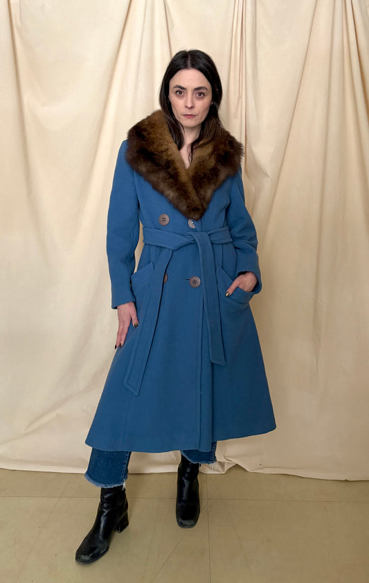 1970s Blue Wool Trench with Fur Collar