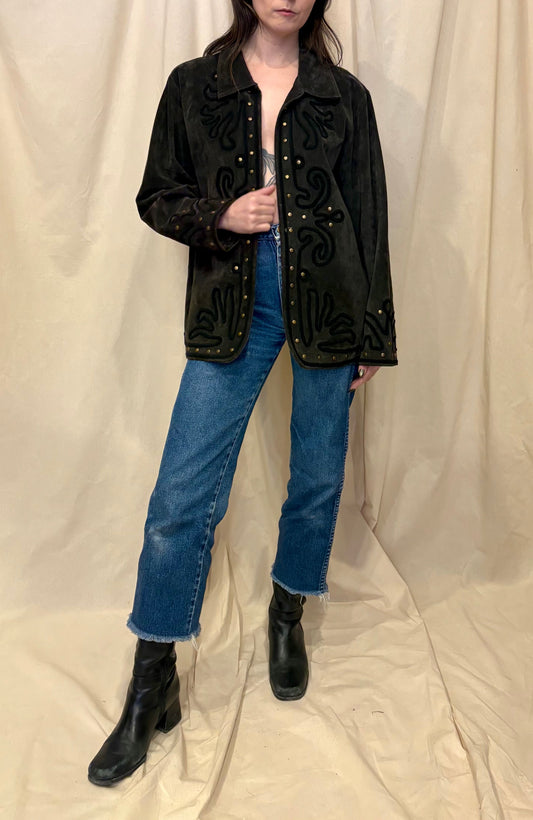 Dark Brown Suede Jacket with Braided Trim and Gold Studding