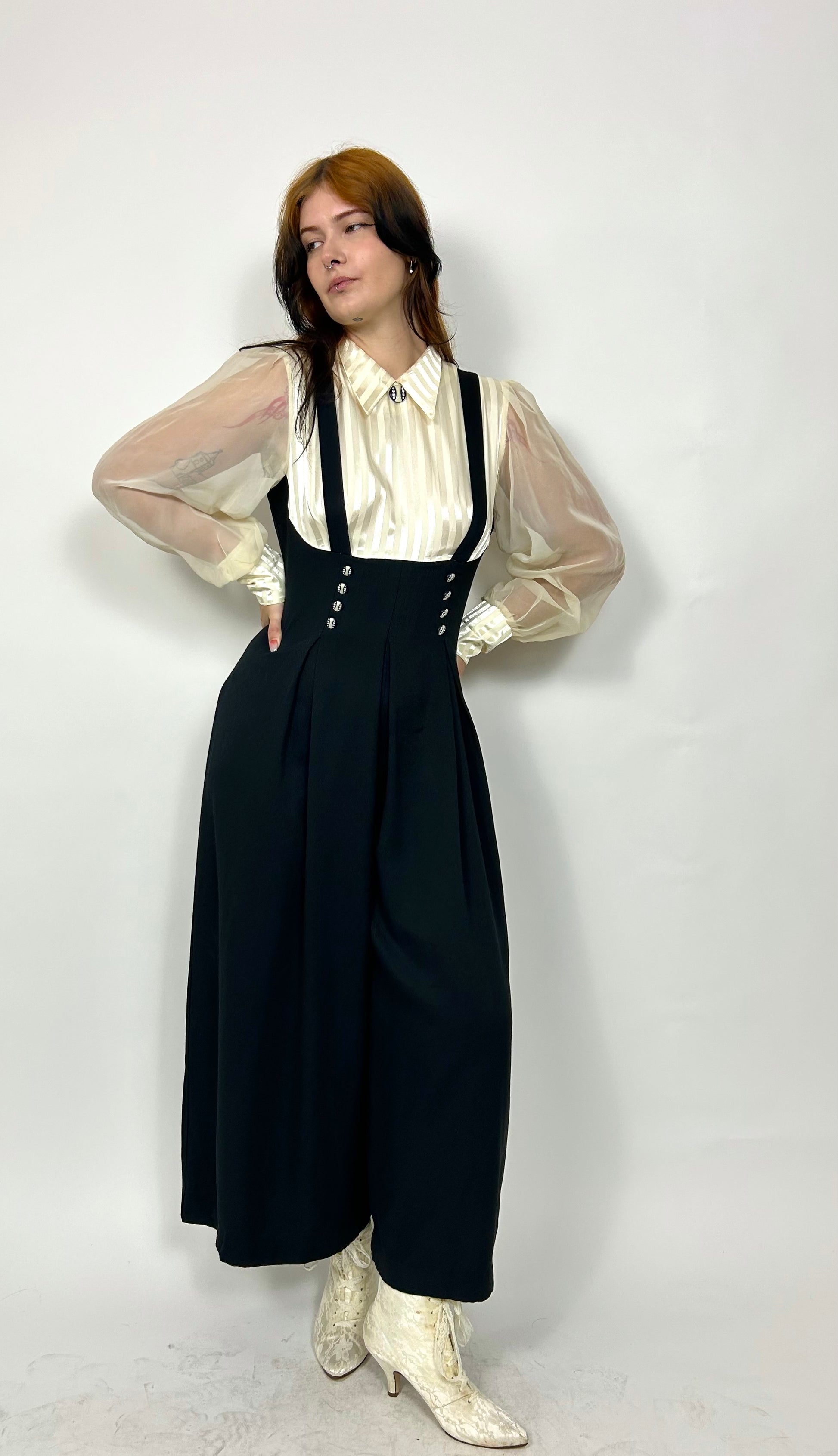 Very fun jumpsuit with built in suspenders and big sleeves! Tagged a 10.