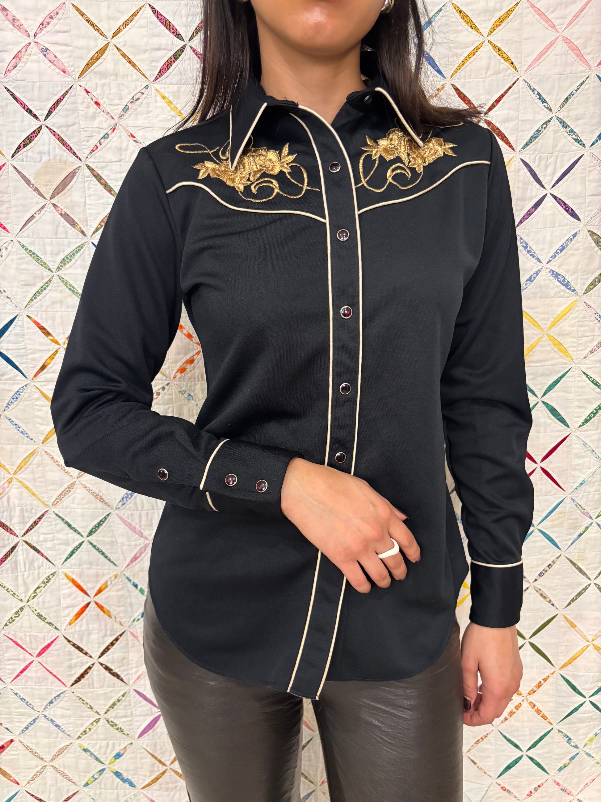 1970s black western shirt with gold embroidered roses and white piping, made in Canada.