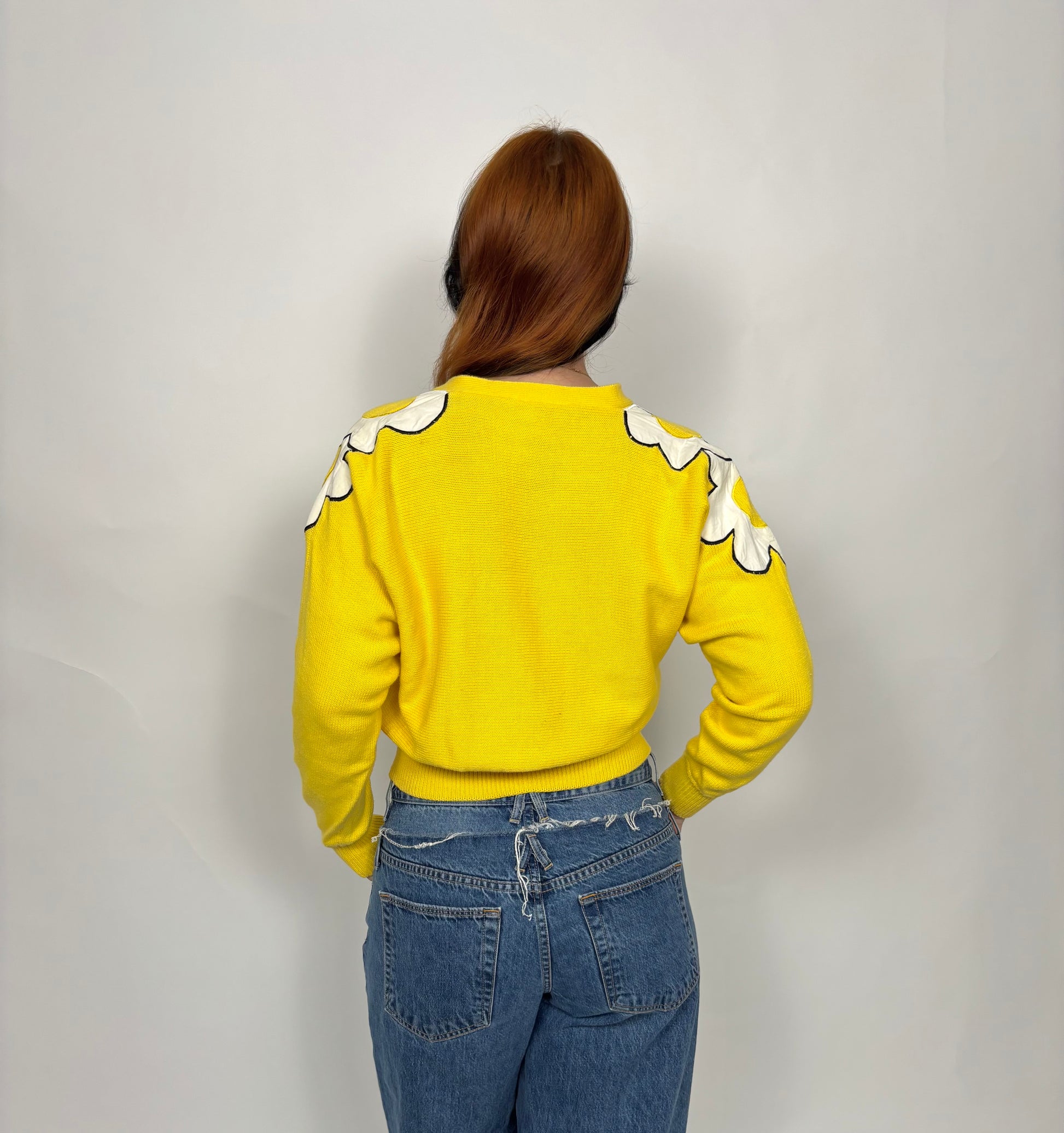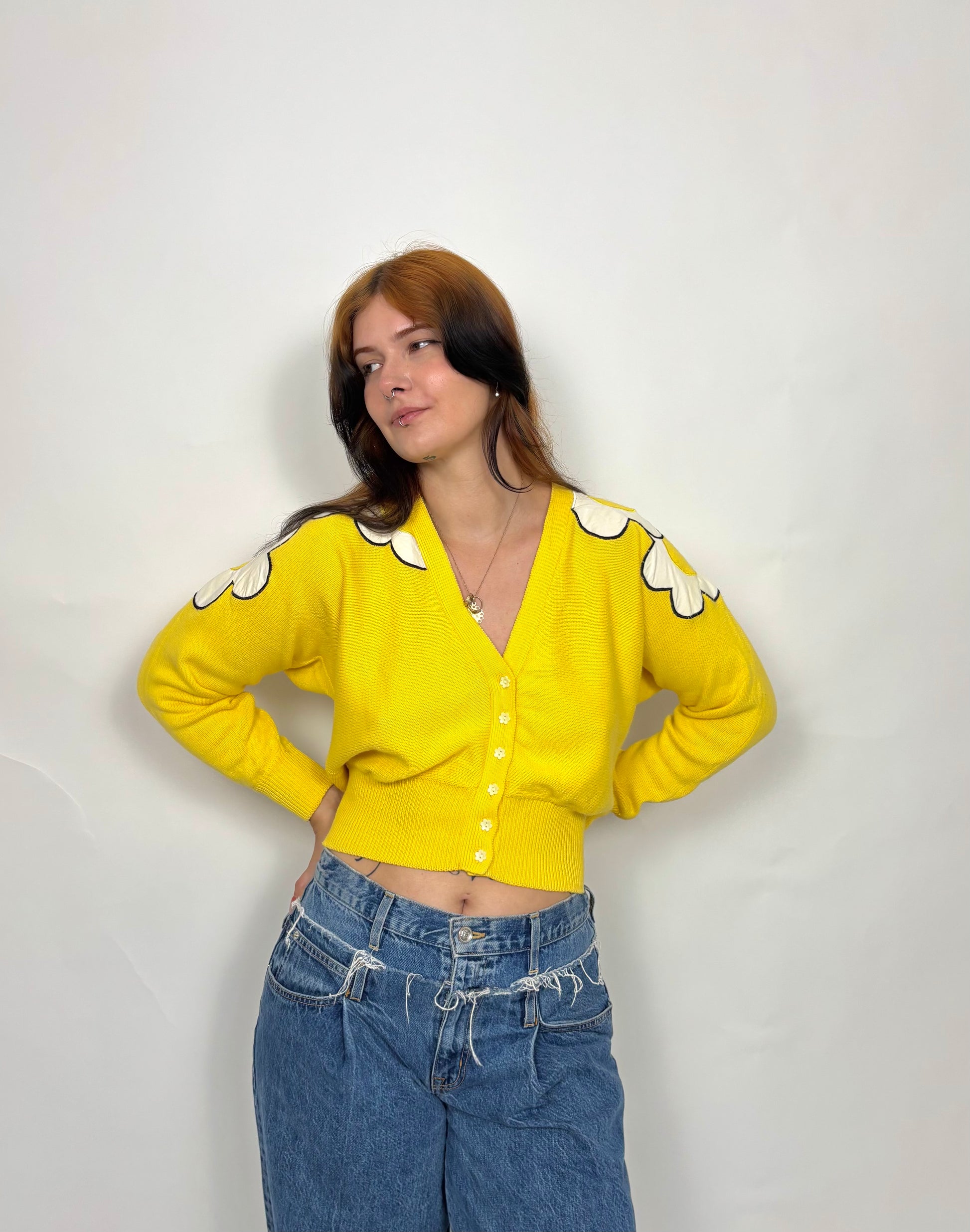 Cute cotton cardigan with flower buttons, batwing sleeves and Daisy appliqués on the shoulders. Small/medium.