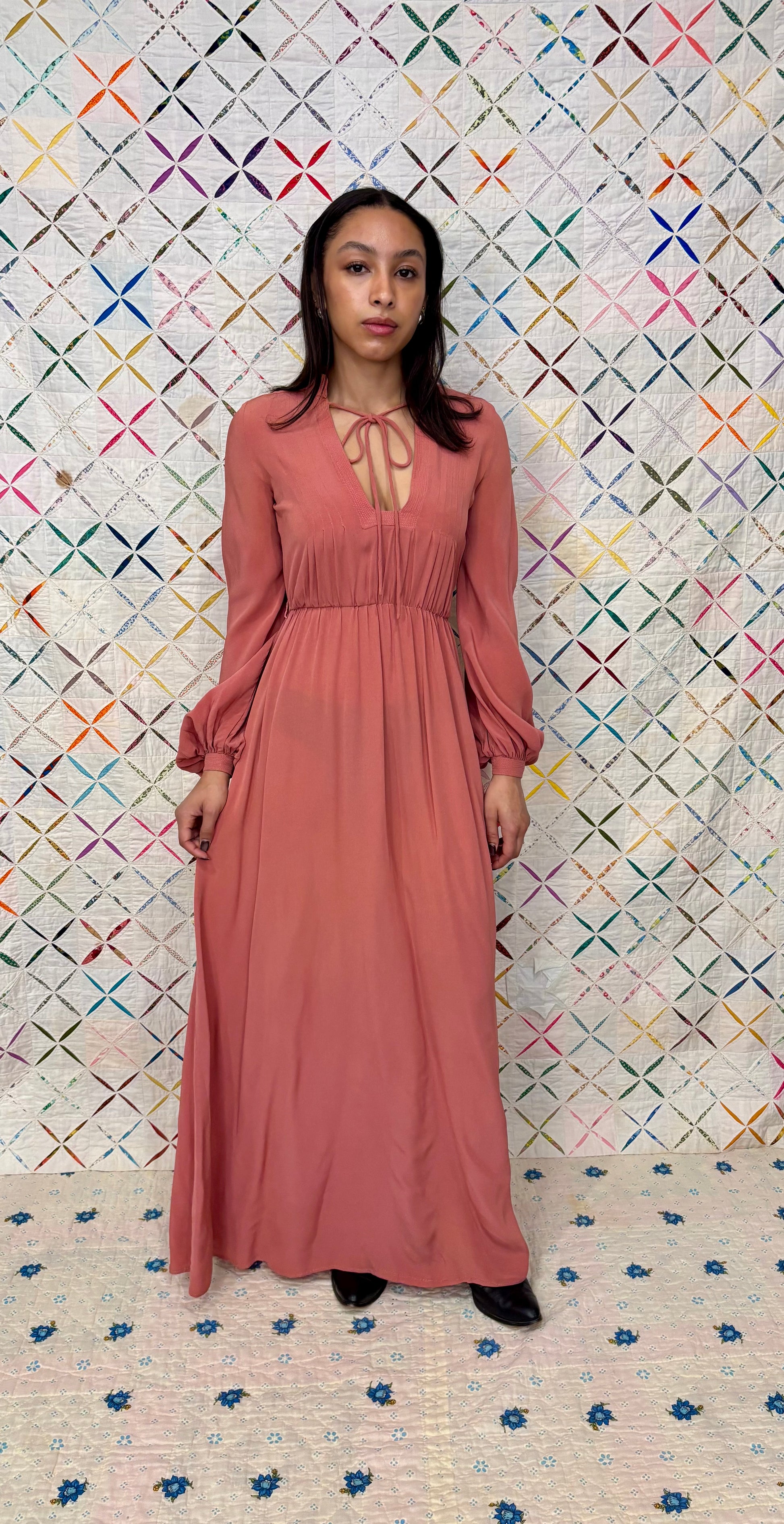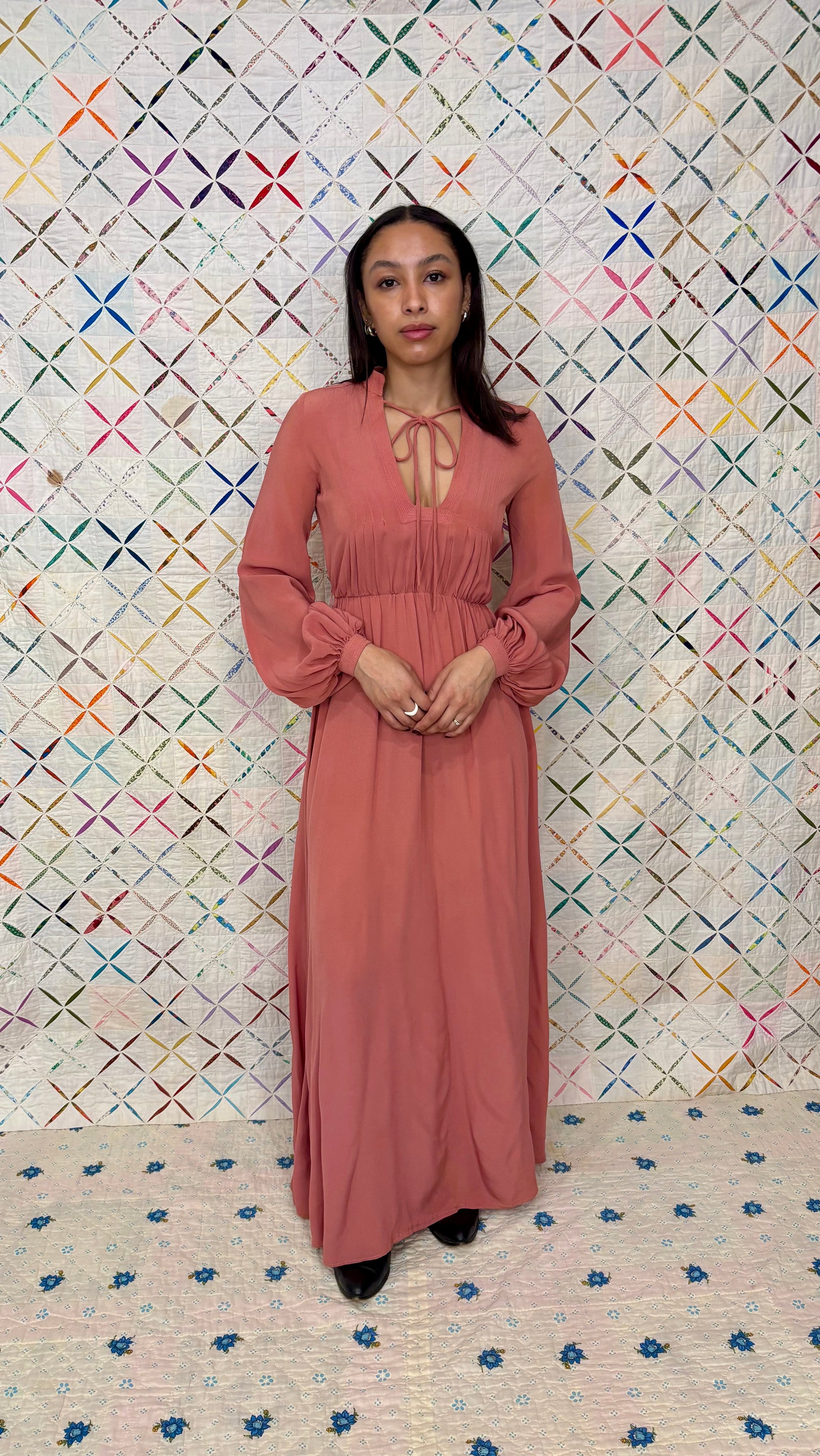 70s rose coloured maxi dress with bishop sleeves