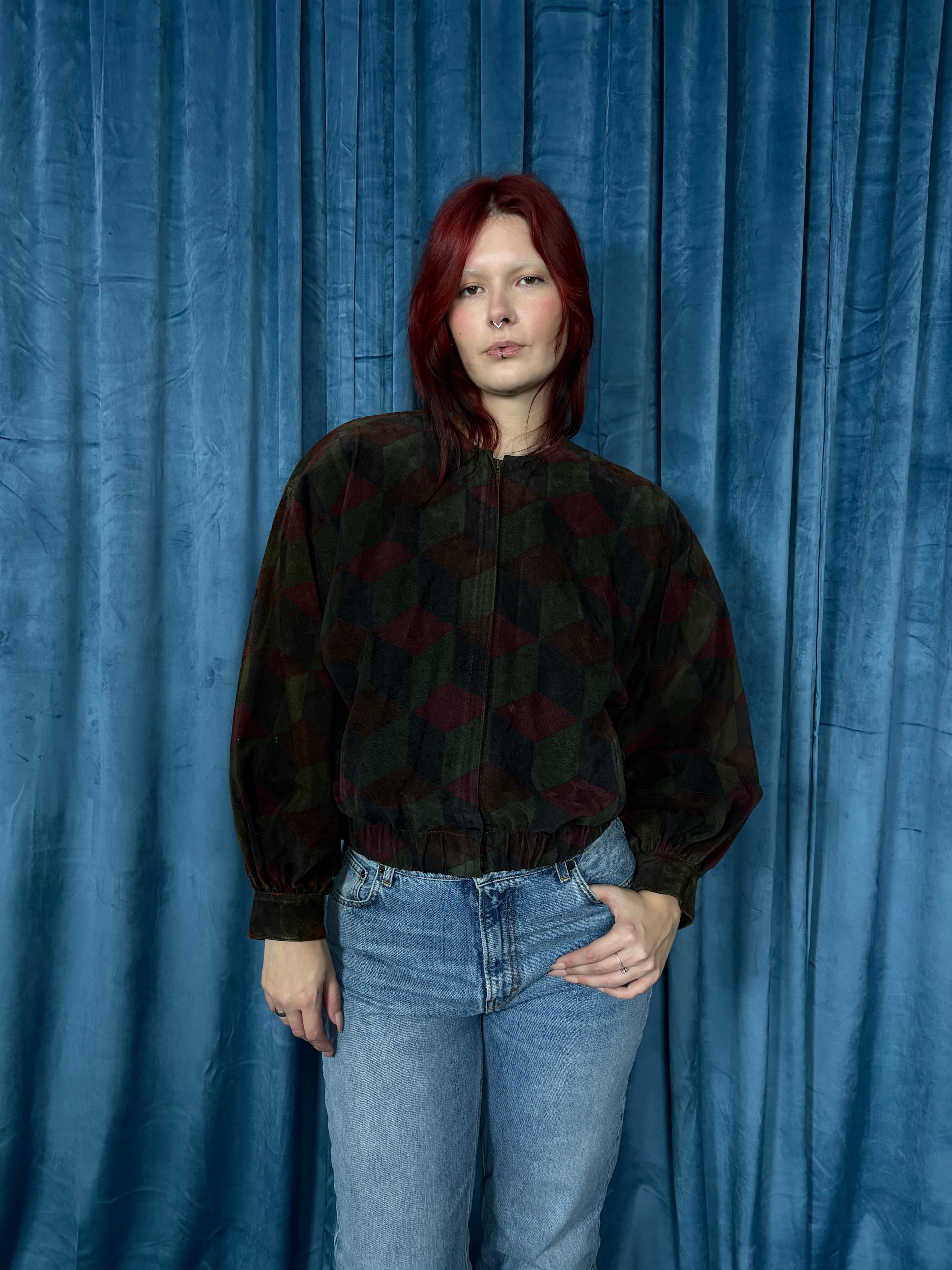 1980s suede geometric print jacket with gorgeous puff sleeves by Sibylle Lyn