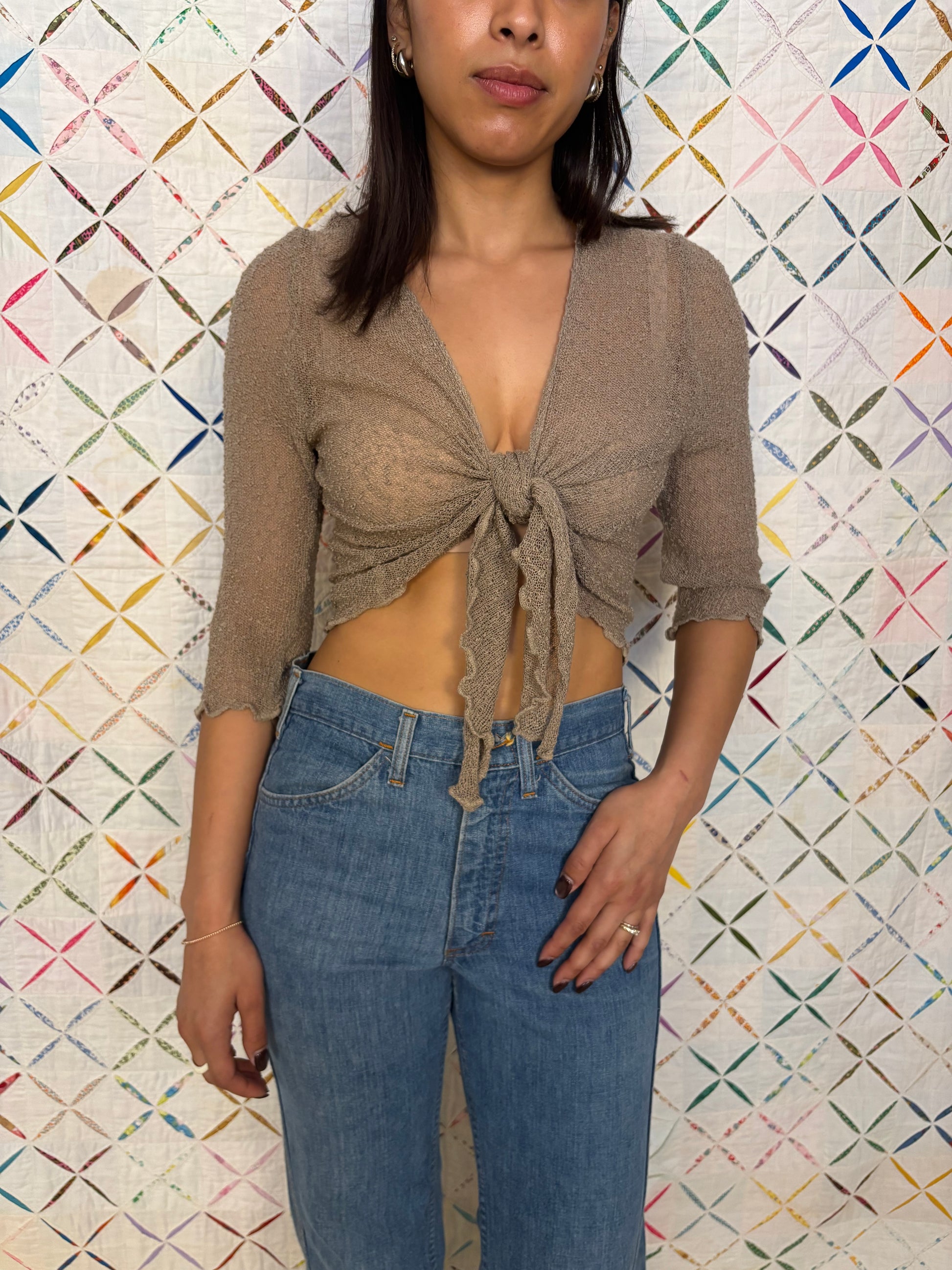 90s romantic tie up shirt with ruffle hem, acrylic and nylon blend, best fits a s-m