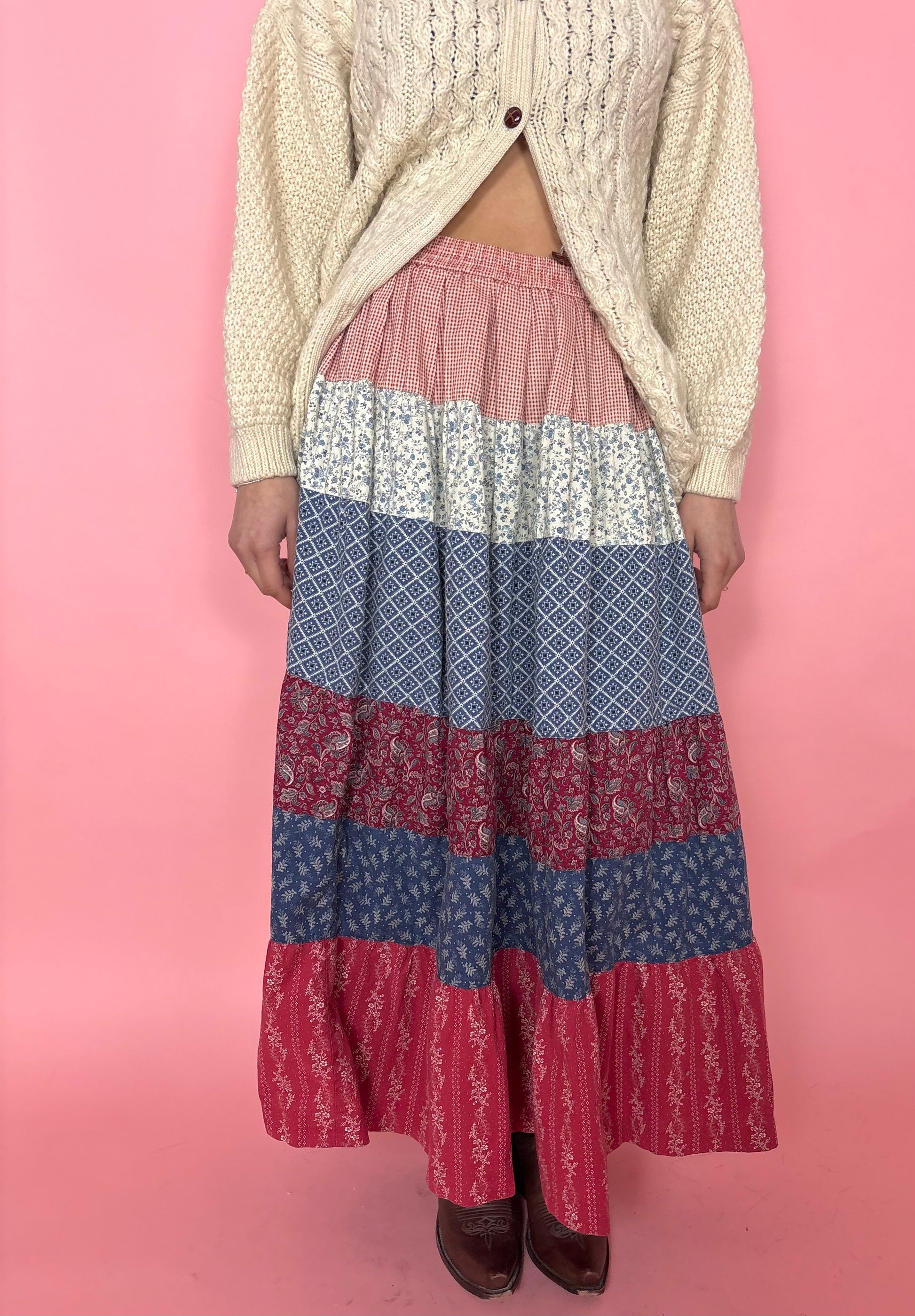 Beautiful cotton prairie skirt with tiered panels. Tagged a medium.