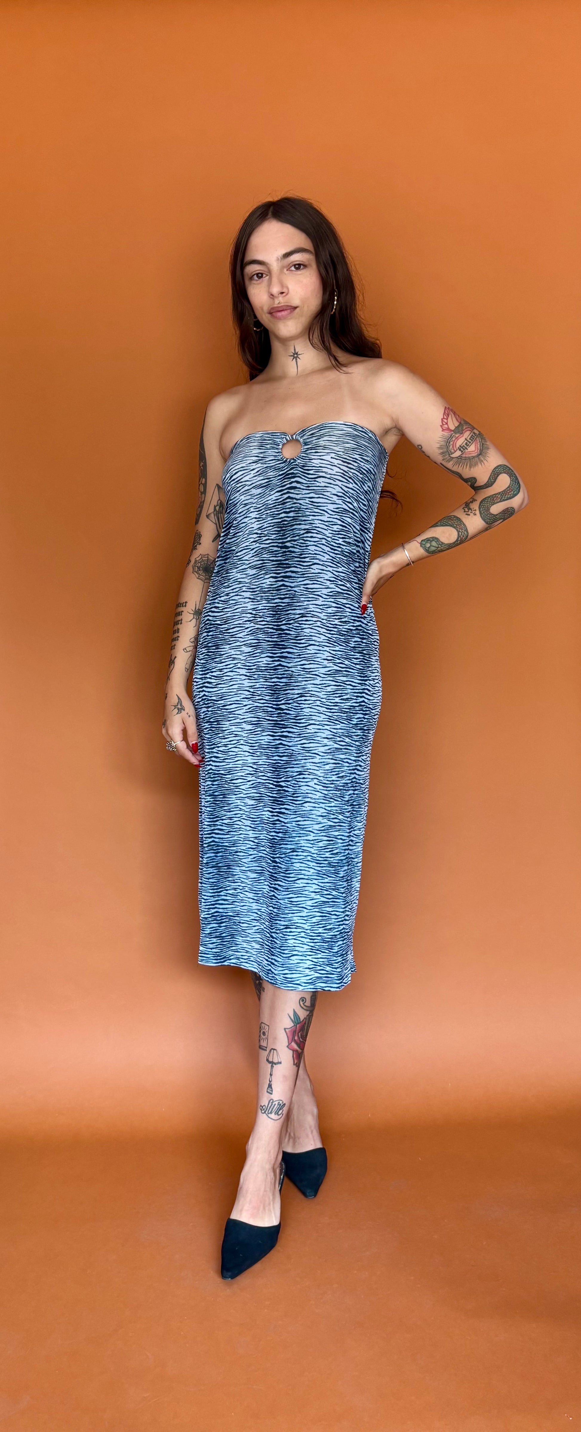 Sexy Y2K tiger print tube dress with a circle cut out at the bust. Fits small/medium with good amount of stretch.